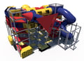 The IP23105 is a large-scale playground designed for kids aged 2-12, accommodating up to 60 children at once. Spanning 26'-11" L x 25'-8" W x 16'-4" H, it features a Turbo Helicopter, multiple crawl tunnels, a crawl maze, spiral tube slides, and dual 8-Level Deck Climbs for endless play opportunities.