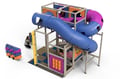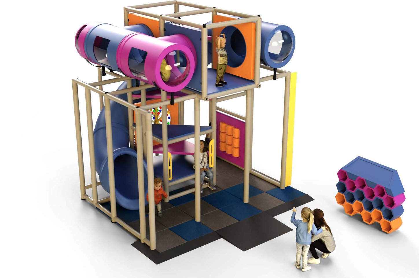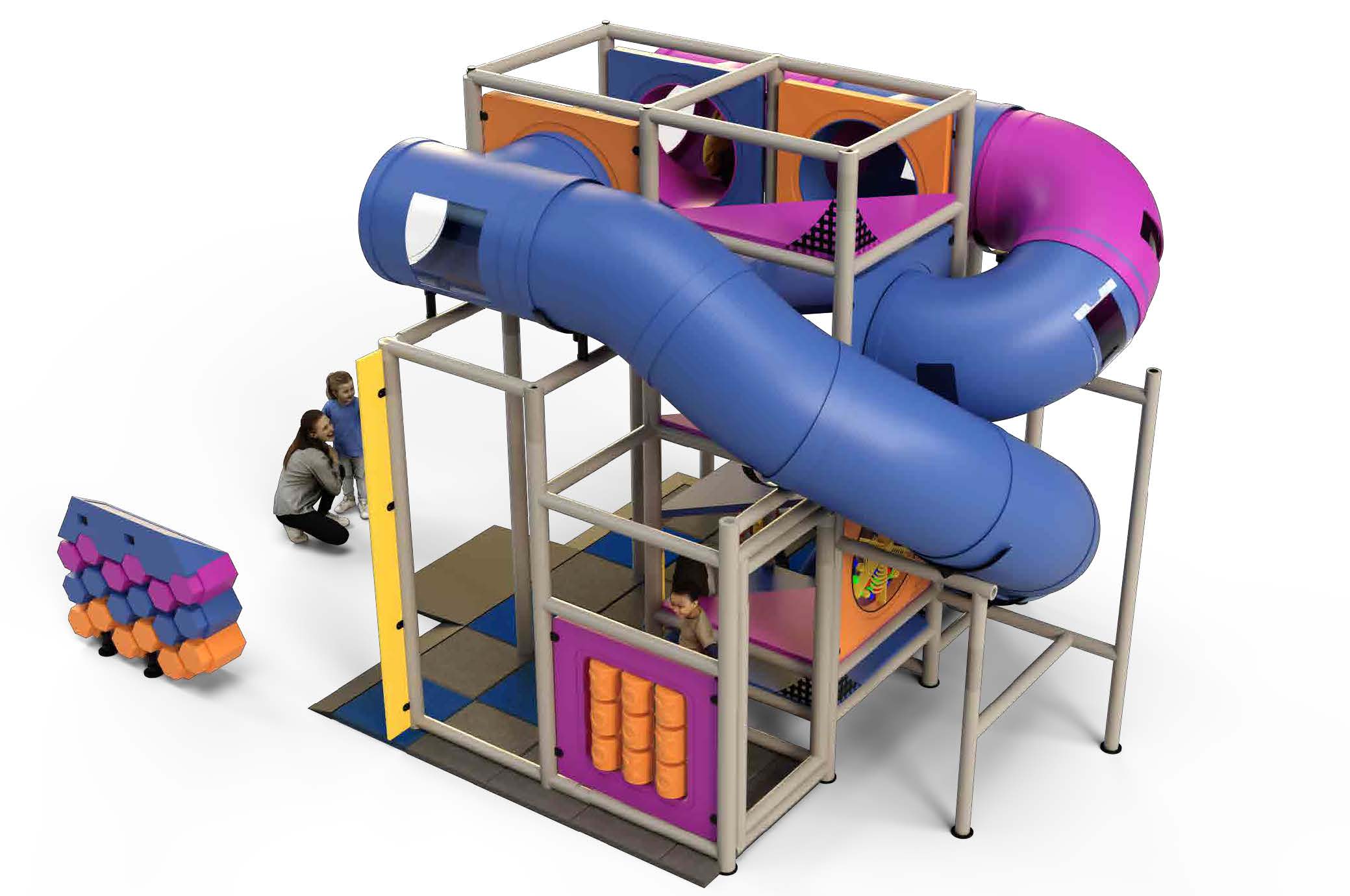 This compact indoor playground boasts a tube slide, crawl tunnels, activity panels, and more.